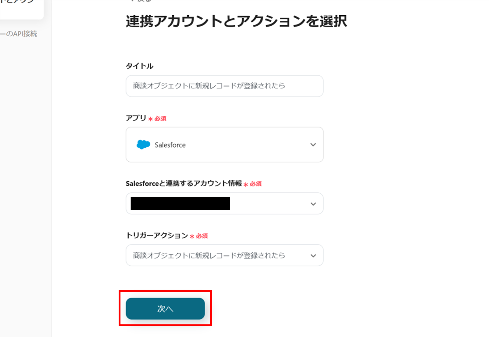(2)Salesforceの「連携アカウントとアクションを選択」画面から、Salesforceと連携するアカウント情報に誤りがないかを確認し、トリガーアクションは「商談オブジェクトに新規レコードが登録されたら」のままで「次へ」をクリックします。