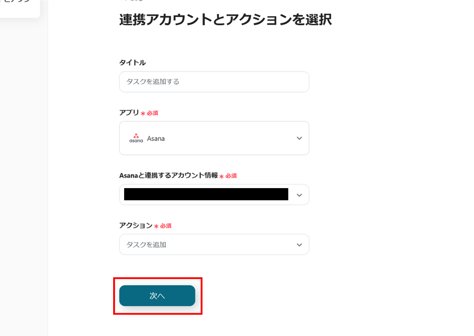 (2)Asanaの「連携アカウントとアクションを選択」画面から、Asanaと連携するアカウント情報に誤りがないかを確認し、アクションは「タスクを追加」のままで「次へ」をクリックします。