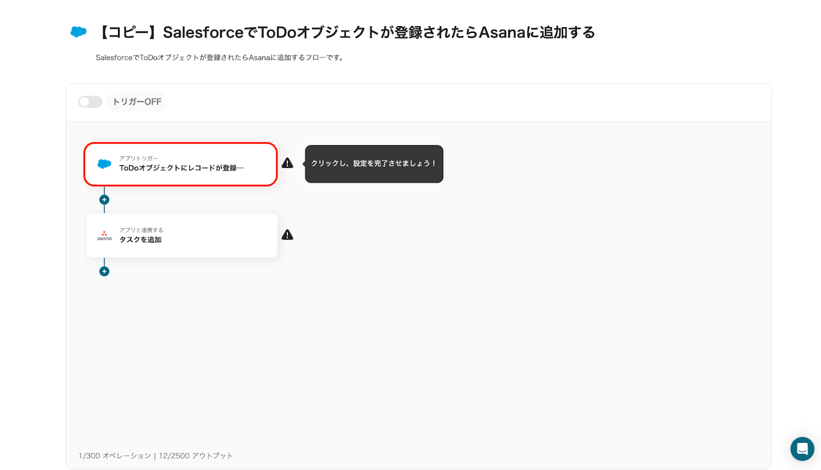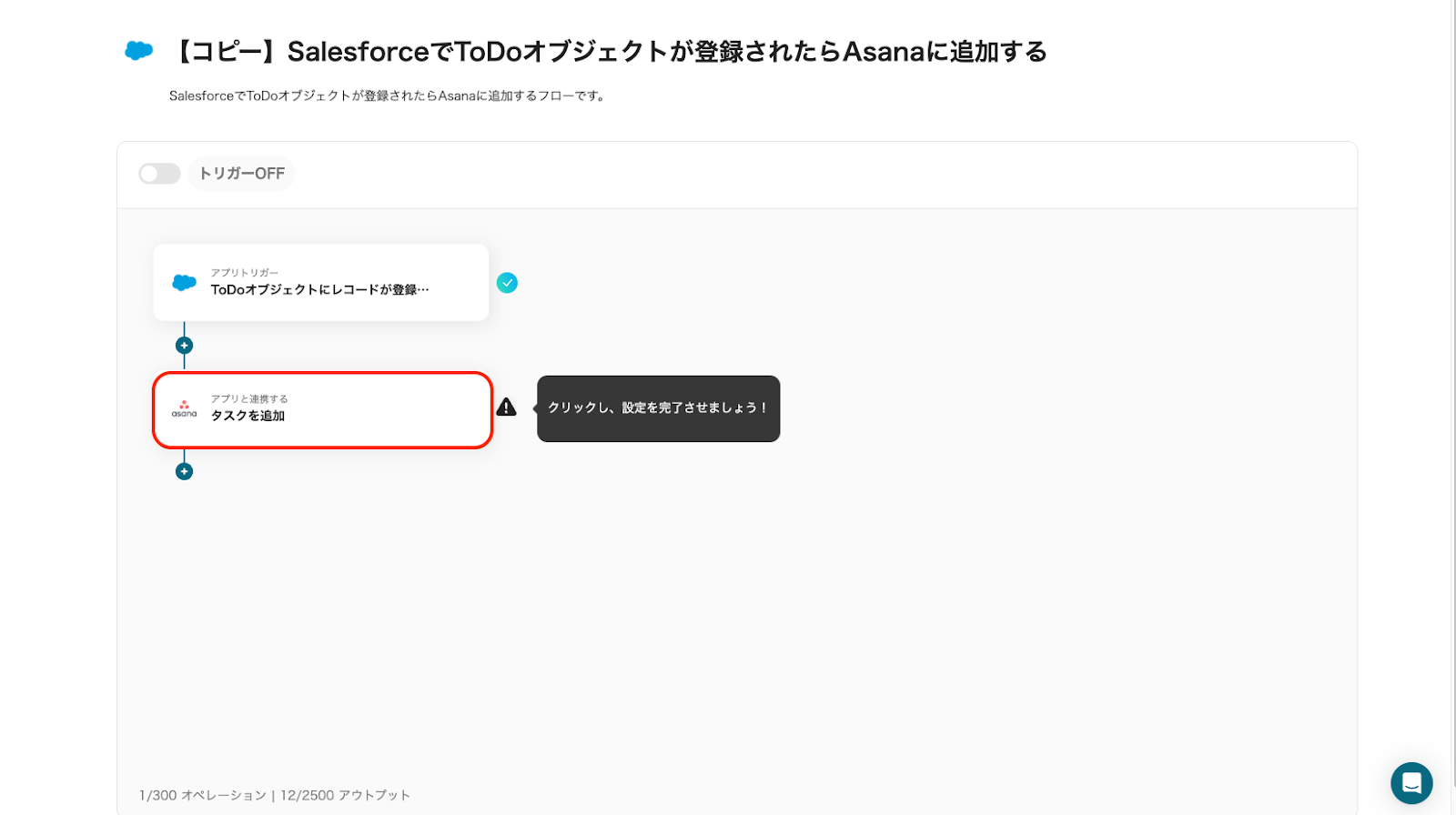 最後に「トリガーをON」をクリックし、フロー稼働の準備が完了です。これで、SalesforceでToDoオブジェクトが登録されたらAsanaにタスクが自動追加されます。