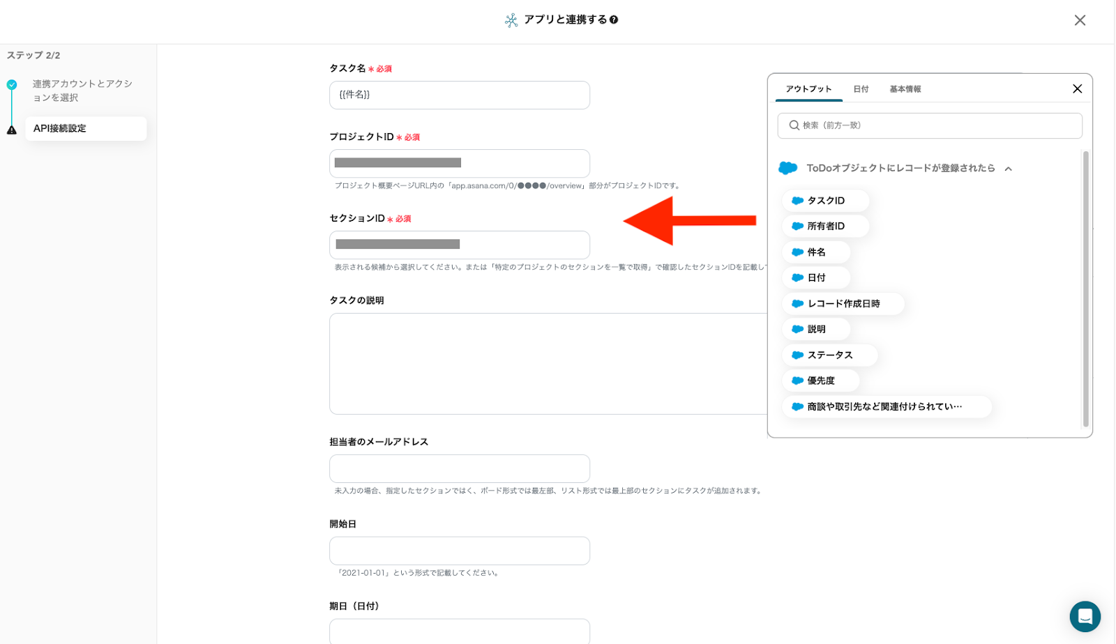 「プロジェクトID」と「セクションID」は、注釈を参照しAsanaから取得した値を記載するか、候補から該当項目を選択してください。