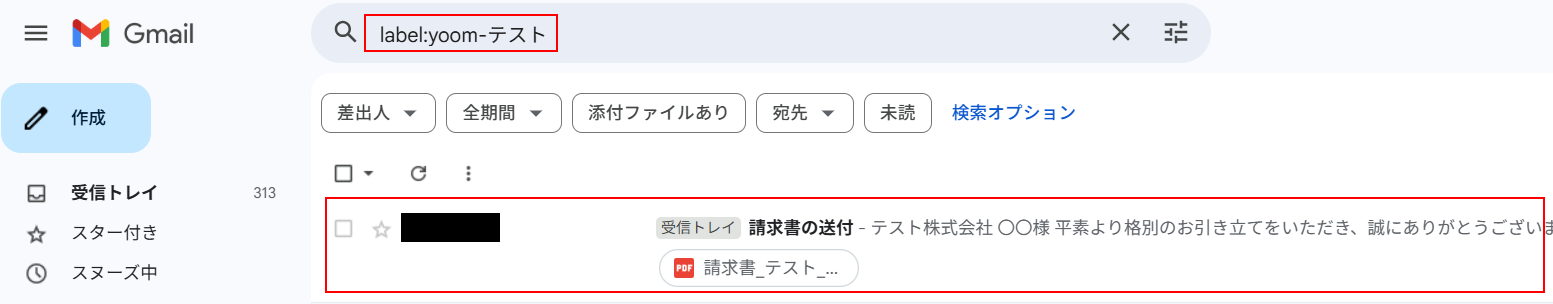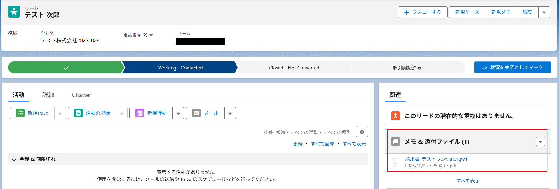 次に、Salesforceのテスト用リードとして登録しているメールアドレスから、ステップ1で連携したGmailアカウントのメールアドレスへ、添付ファイルを付けたメールを送ります。