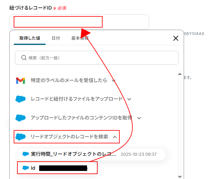 入力欄をクリックし、リードオブジェクトのレコードを検索から先ほど追加したIDを選択してください。