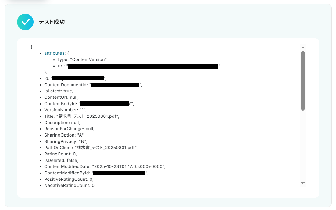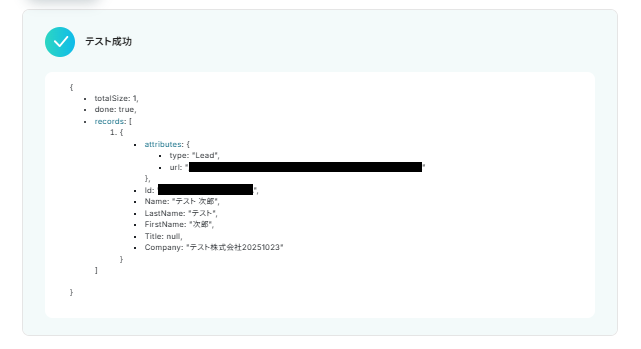 テストに成功するとテスト成功画面と取得した値が表示されますのでご確認ください。