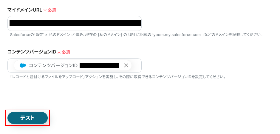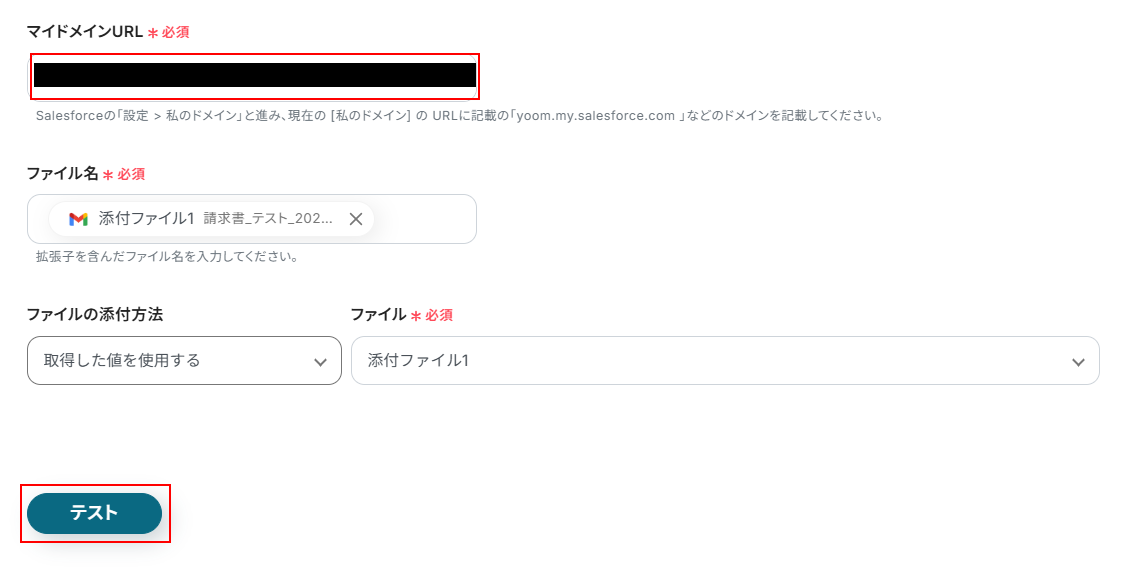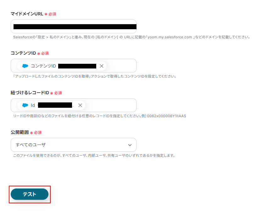 ※テストをクリックすると、実際にファイルとレコードが紐付けられます。