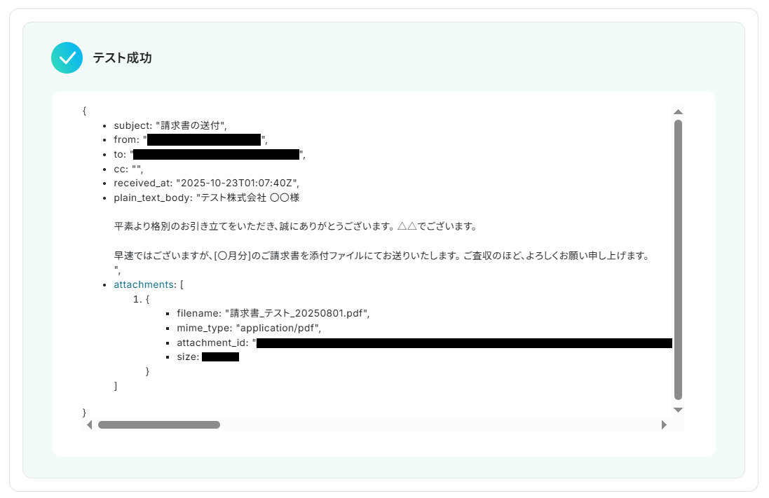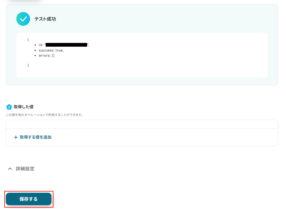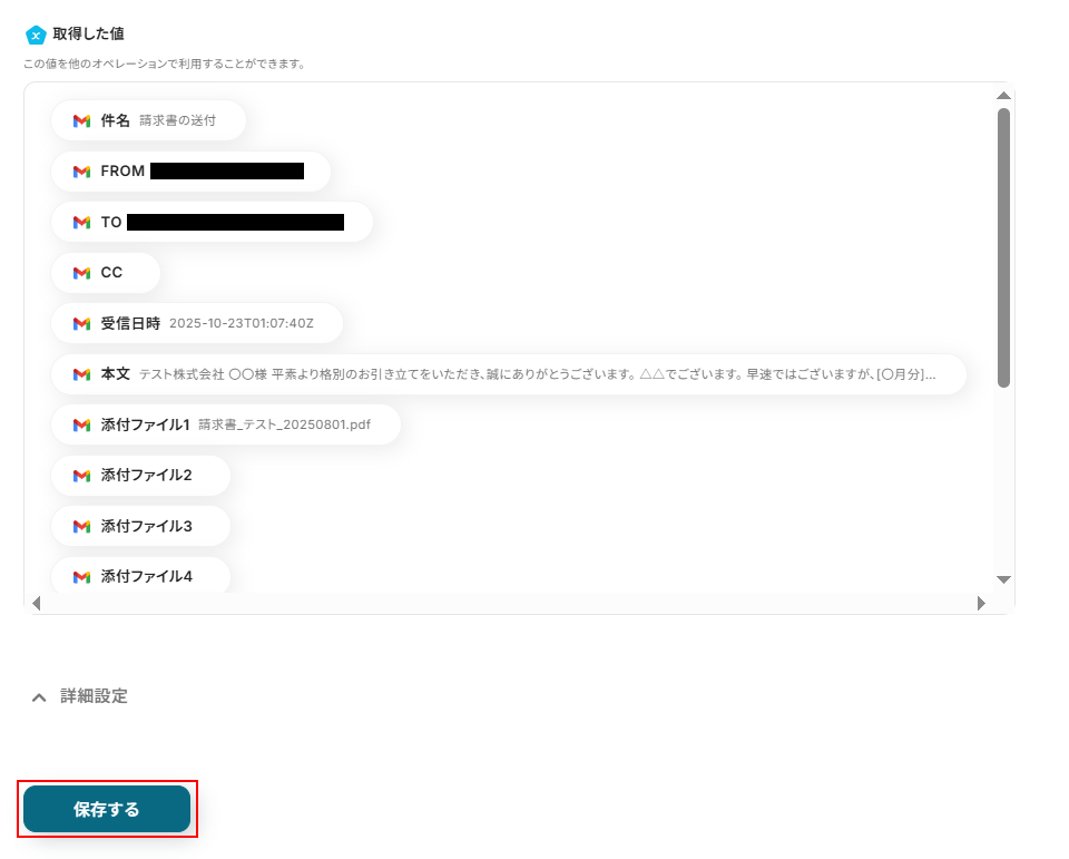 テストが成功するとテスト成功画面と取得した値が表示され、Gmailのデータが確認できます。「保存する」をクリックして完了です!