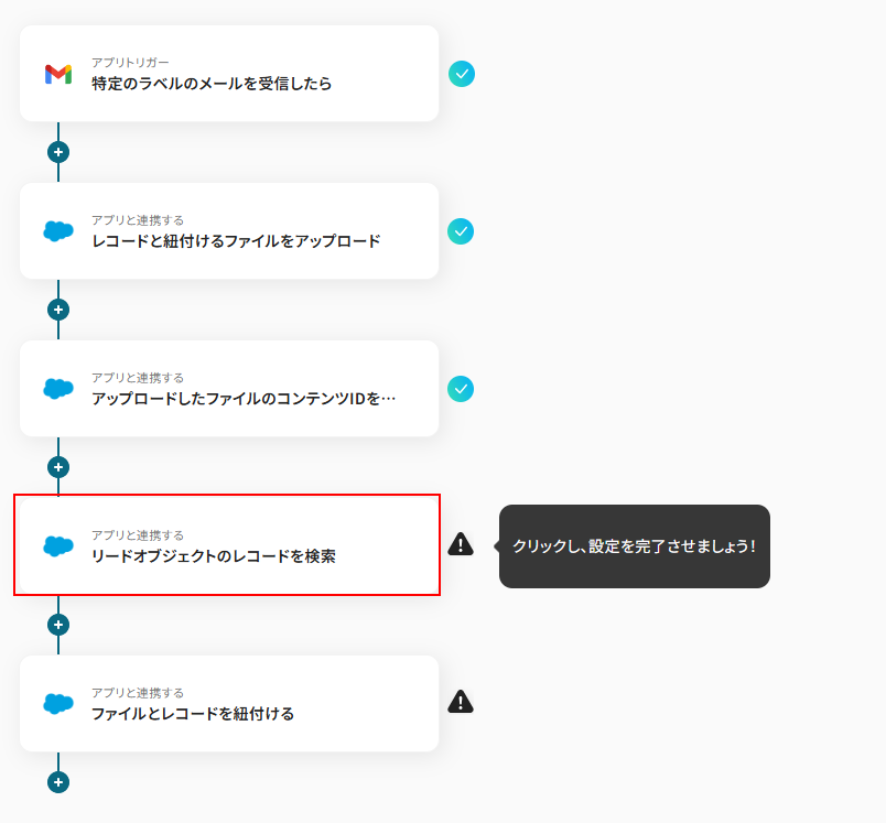 リード以外のオブジェクトに添付するには、ステップ6のアクションを変更する必要があります。Salesforceのアクションには、取引先オブジェクトのレコードを検索、商談オブジェクトのレコードを検索などがございます。ファイルを添付したいオブジェクトの、~のレコードを検索となっているアクションを選択してください。