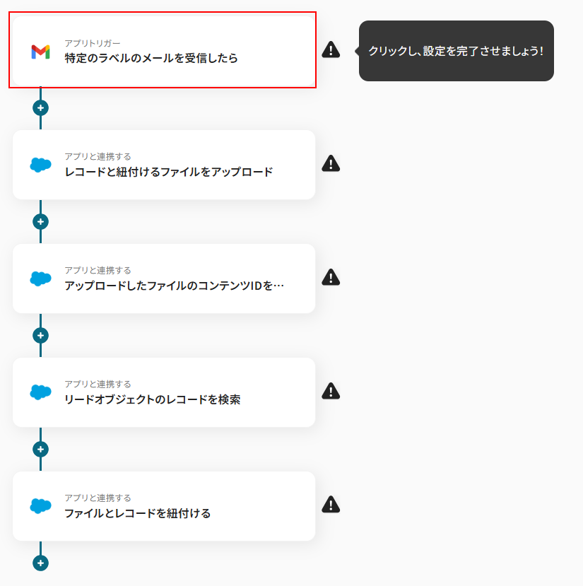 Gmailに届いた請求書や申込書などの添付ファイルを、都度手作業でSalesforceにアップロードしていませんか?この作業は時間がかかるだけでなく、ファイルの添付漏れや、紐付け先のレコードを間違えるといったミスも起こりがちです。このワークフローを活用すれば、特定のGmailを受信するだけで添付ファイルがSalesforceに自動でアップロードされ、関連するレコードに紐付けられるため、こうした定型業務の効率化を実現します。