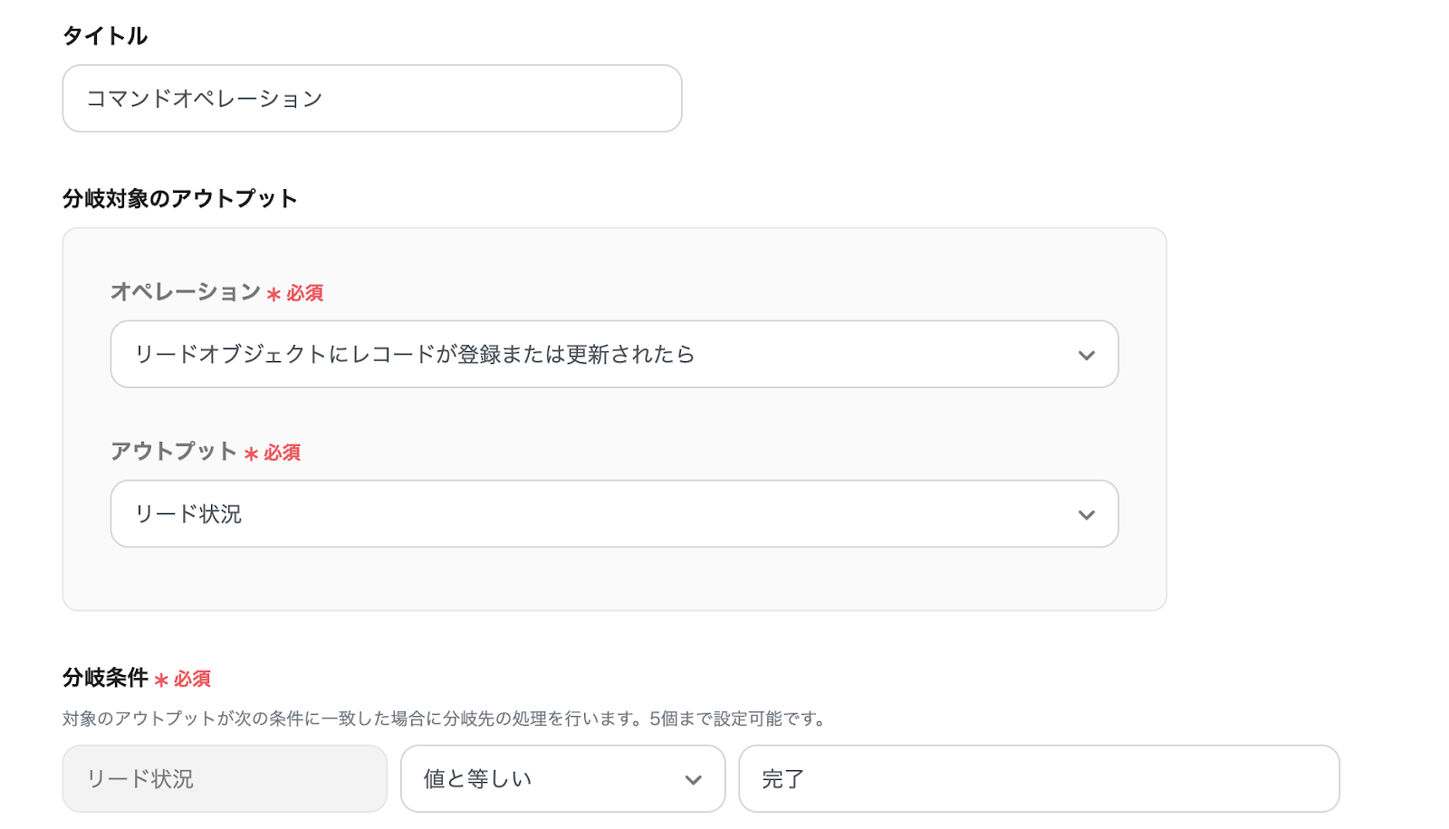 このテンプレートでは、アウトプットとして「リード状況」が設定されているので、「リード状況」が「値と等しい」ものである場合に分岐先の処理を行います。