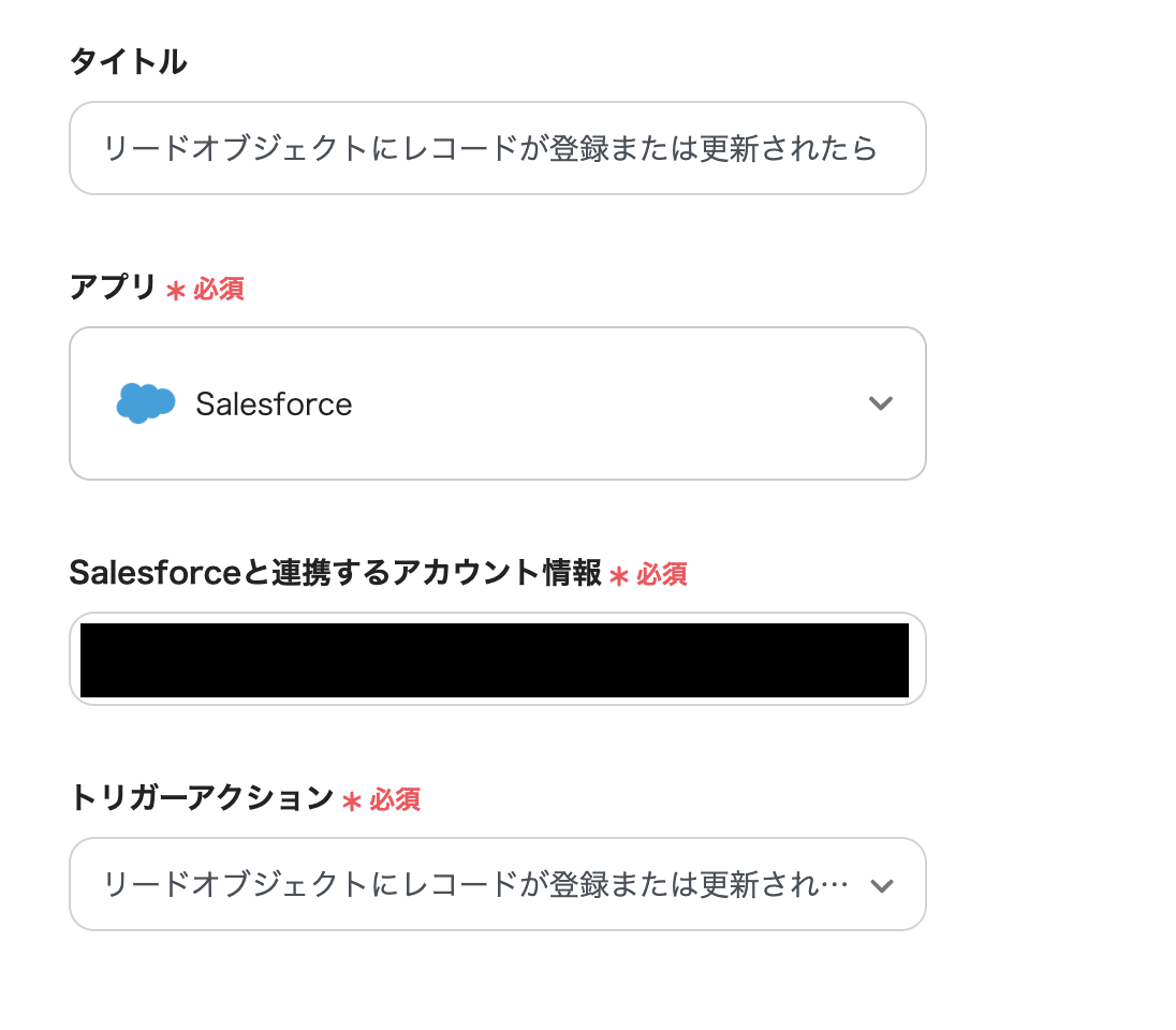 (3)Salesforceと連携するアカウント情報を入力し、トリガーアクションは「リードオブジェクトにレコードが登録または更新されたら」のままにして、[次へ]をクリックしてください。