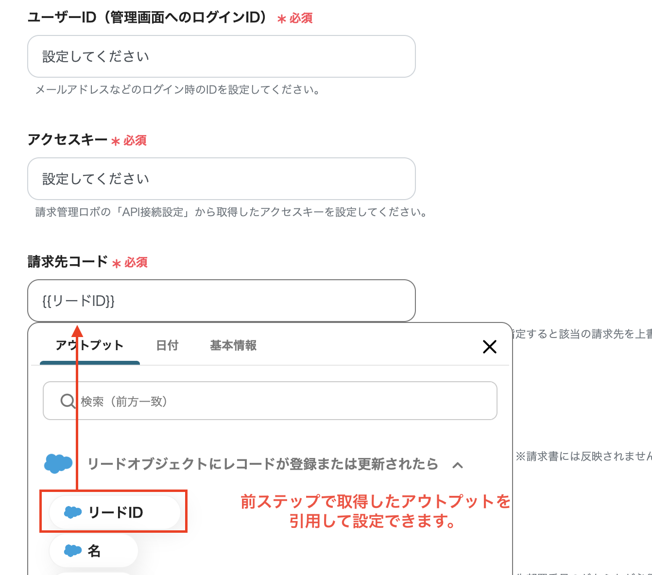 以下の画面のように、項目によっては前ステップで取得したアウトプットを選択することができます。