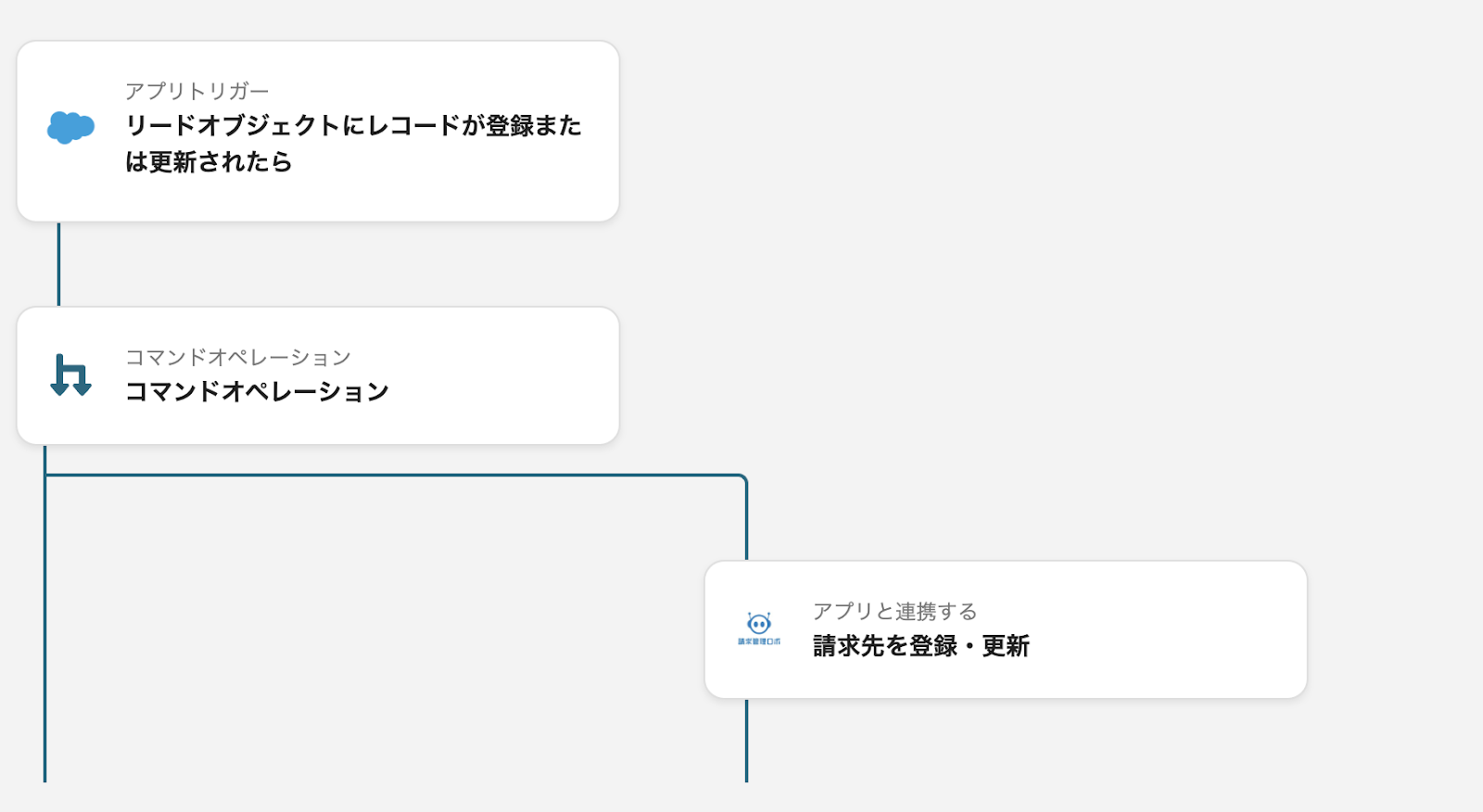具体例として、これまでSalesforce側で更新作業を行った後、請求書の管理を行っている請求管理ロボに手動で更新した情報を入力する必要がありました。