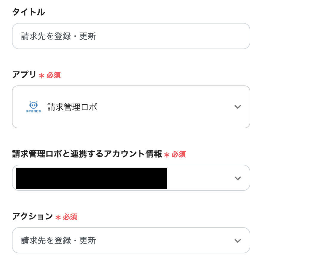 (2)請求管理ロボと連携するアカウント情報を入力し、アクション項目は「請求先を登録・更新」のまま、[追加]をクリックします。