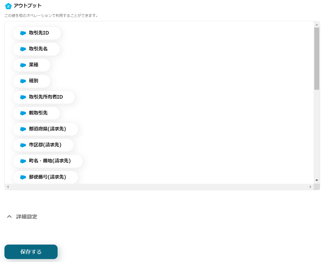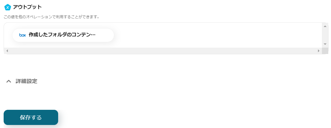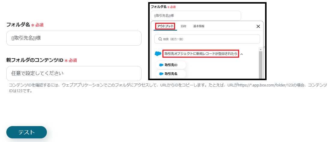 ※フォルダ名は、定型文を直接入力できます。また、枠をクリックして表示されるアウトプットの「取引先オブジェクトに新規レコードが登録されたら」からも選択できます。(値は二重括弧で表示されます)これにより、取引先ごとに変わる内容を動的に反映できます。