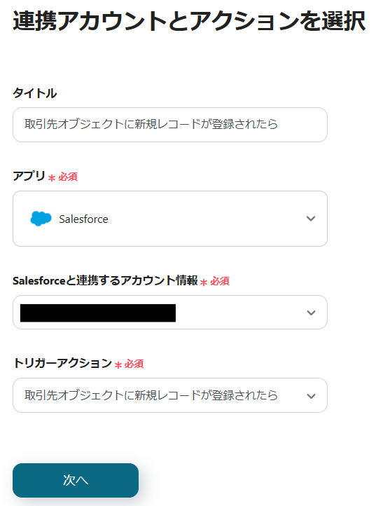 3.Salesforceと連携するアカウントを確認し、「次へ」をクリックします。