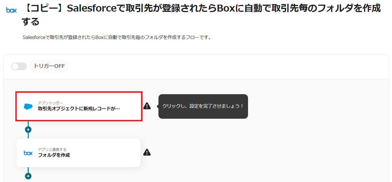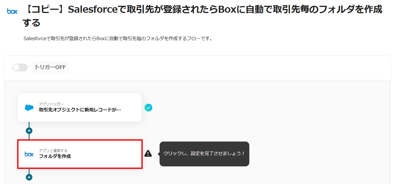 最後に、Salesforceに登録した取引先の専用フォルダをBoxに作成する設定を行います。