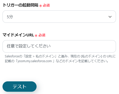 4.トリガーの起動間隔、マイドメインURLを設定し、「テスト」をクリックします。