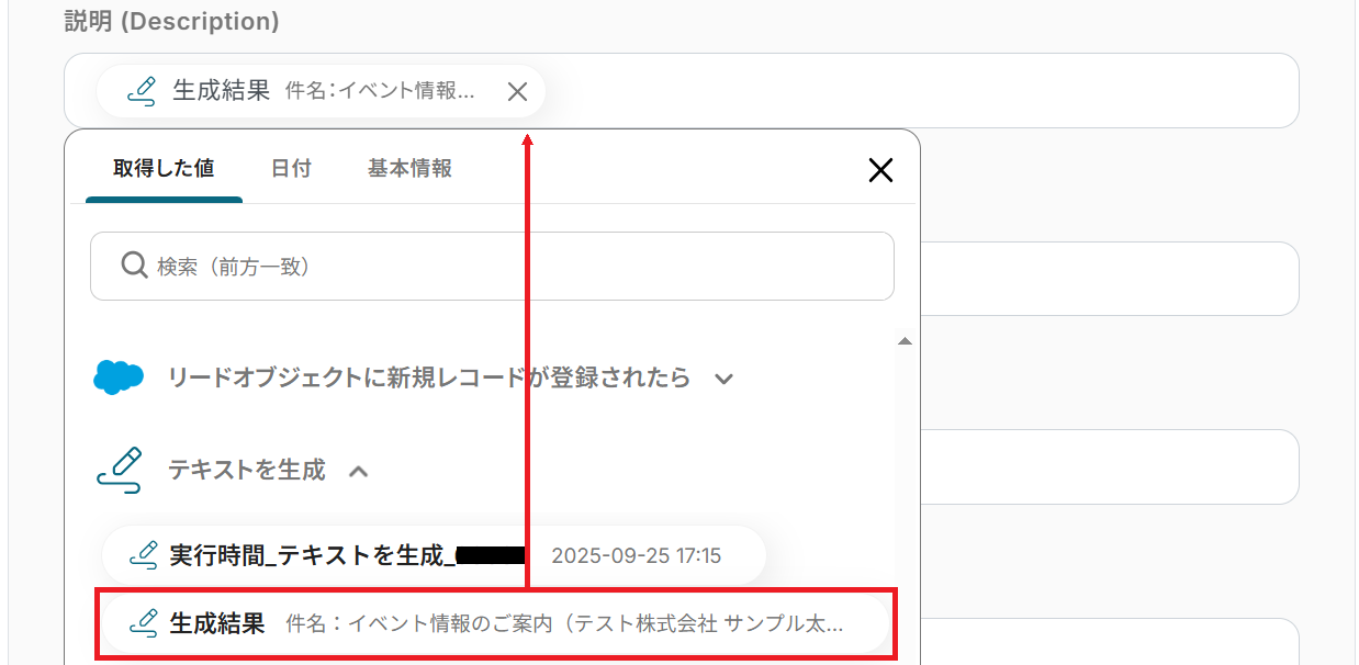 取得した値について、詳しくはこちらをご参照ください。なお、この取得した値をこの後の設定で活用することで、Salesforceのレコードに自動追加可能です。