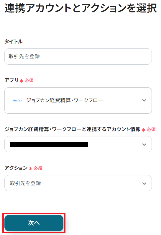 ステップ3と同様、アクションは「取引先を登録」のまま「次へ」をクリックしましょう。