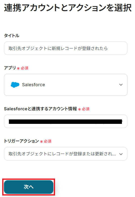 タイトルと連携するアカウント情報を任意で設定し、トリガーアクションはテンプレート通りに「取引先オブジェクトにレコードが登録または更新されたら」のまま「次へ」をクリックしましょう。