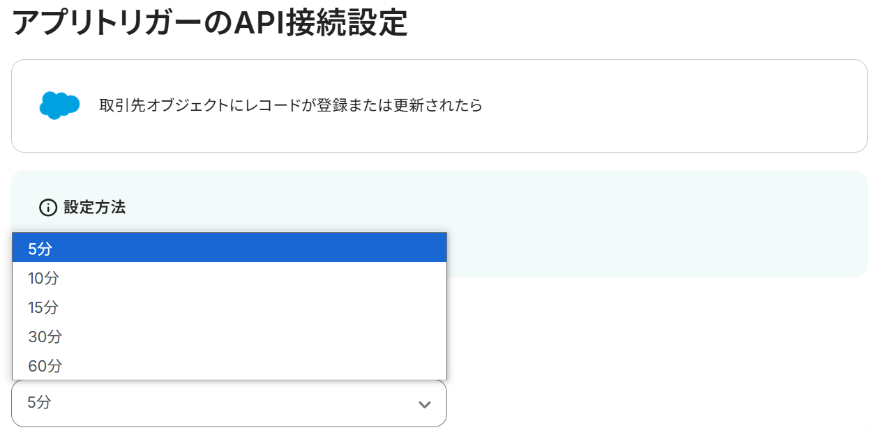 アプリトリガーのAPI接続設定という画面が表示されるので、まずトリガーの起動間隔を選択してください。