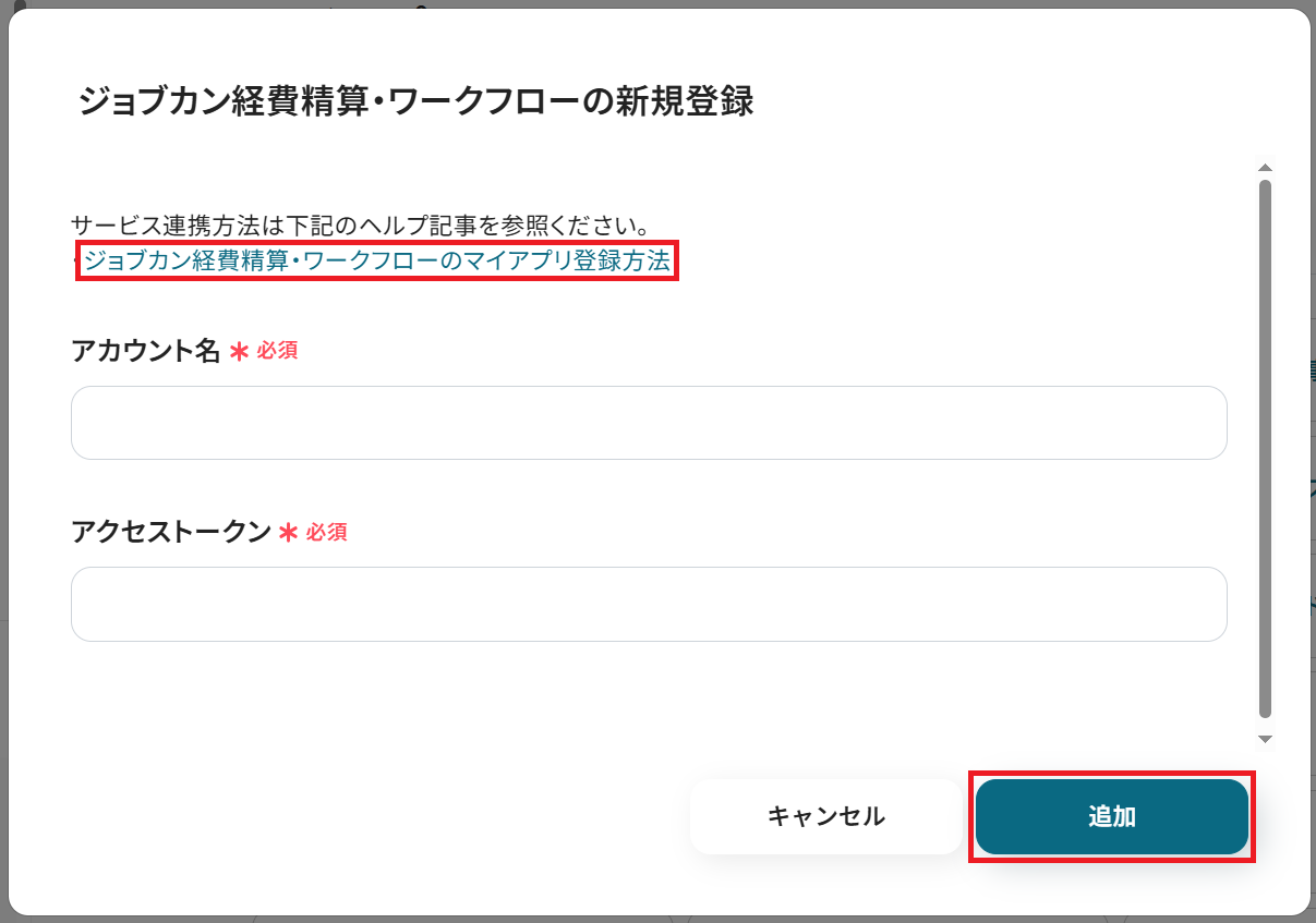 「ジョブカン経費精算・ワークフローのマイアプリ登録方法」を参考に、任意のアカウント名と取得したアクセストークンを入力しましょう。「追加」をクリックするとマイアプリ連携が完了します。