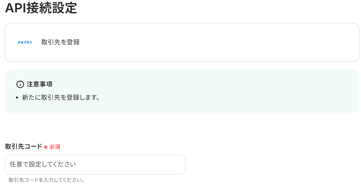API接続設定に移るので必要事項を入力していきます。まず取引先コードを入力してください。
