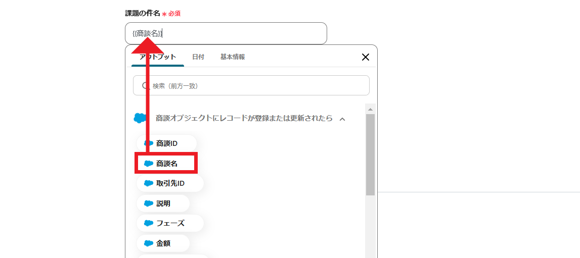 フローボットの設定時、Yoomと連携したSalesforceのデータベースから、カスタム項目も自動的に取得・表示されます。