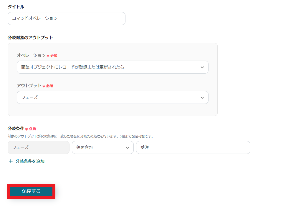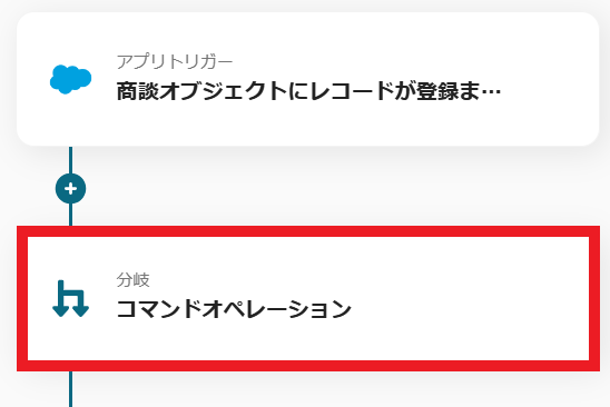 - 次に、オペレーションの分岐機能で、トリガーで取得した情報をもとに後続の処理を実行する条件を設定します。