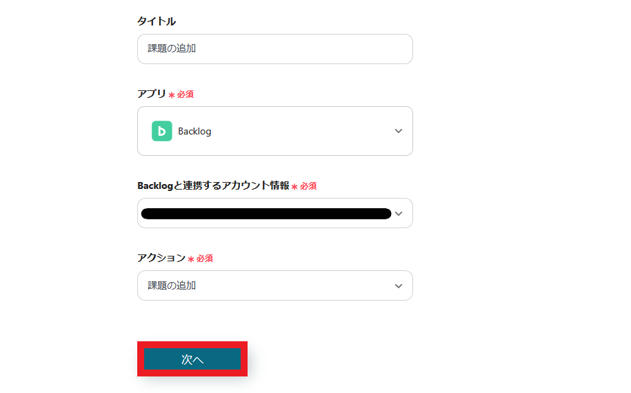 - 最後に、オペレーションでBacklogの「課題の追加」を設定し、取得した情報をもとに課題を作成します。