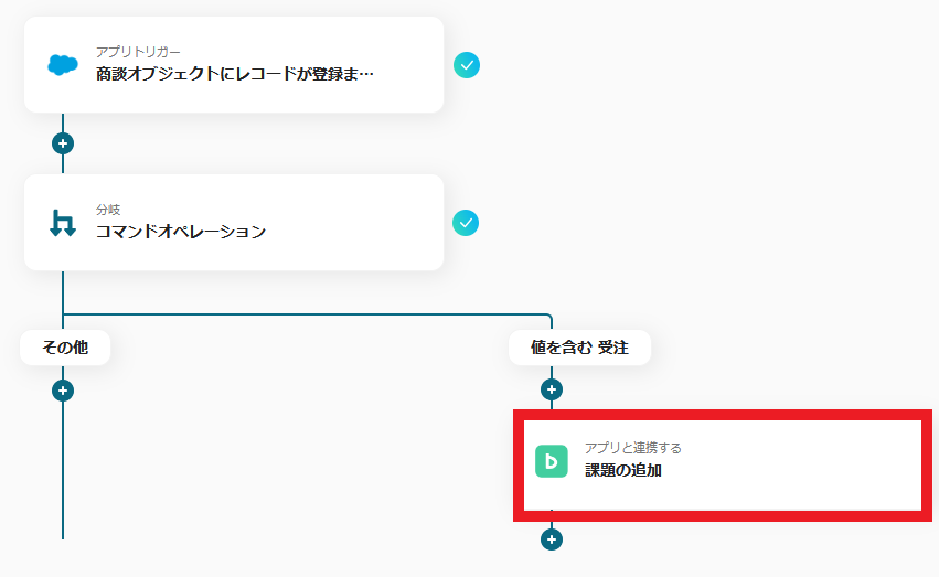 この連携により、「受注」を起点とするタスクの登録漏れを防ぎ、営業部門から開発・納品部門への情報伝達を自動化することで、迅速かつスムーズに後続の業務を開始できるようになるでしょう。