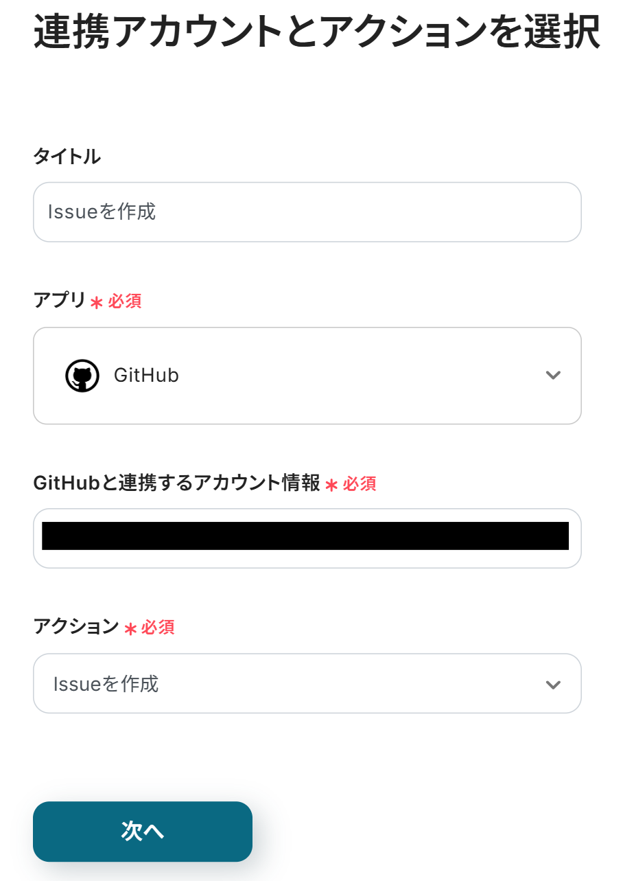 続いて、Issueを作成する設定を行うため、「Issueを作成」をクリックします。