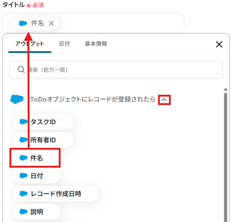 赤枠内の矢印をクリックするとアウトプットが表示されるので、「件名」を選択します。