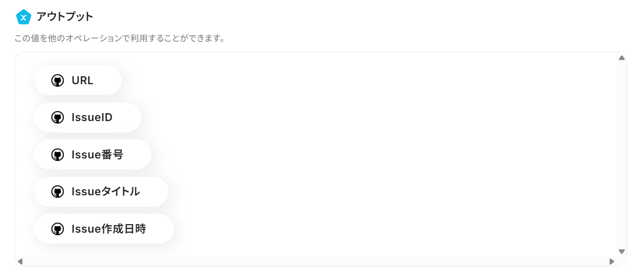 テストが成功すると、「テスト成功」と表示され、以下のアウトプットに値が追加されます。