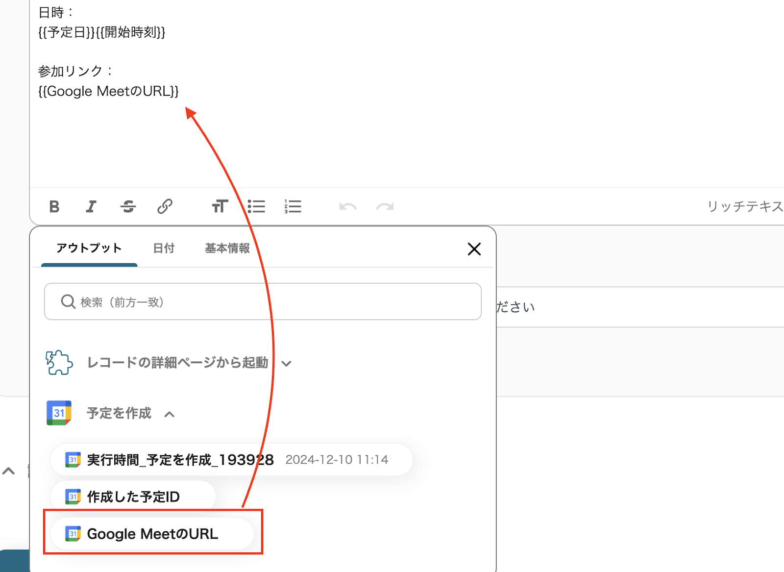 今回は、メール内に『Google MeetのURL』を付与したいため、2つ目のステップから取得したアウトプットをメッセージ内に追加します。