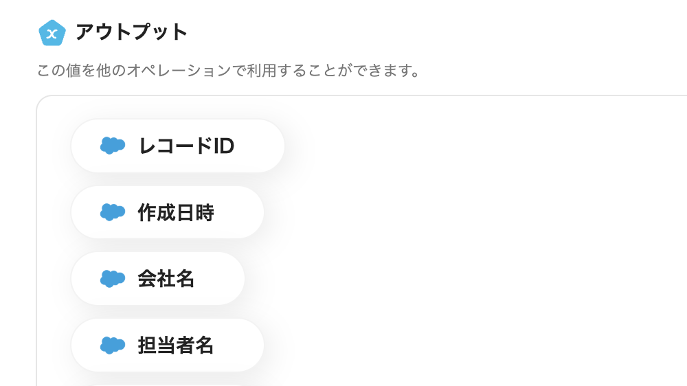なお、このステップでSalesforceに事前に格納されている情報をアウトプットとして取得することが可能です。