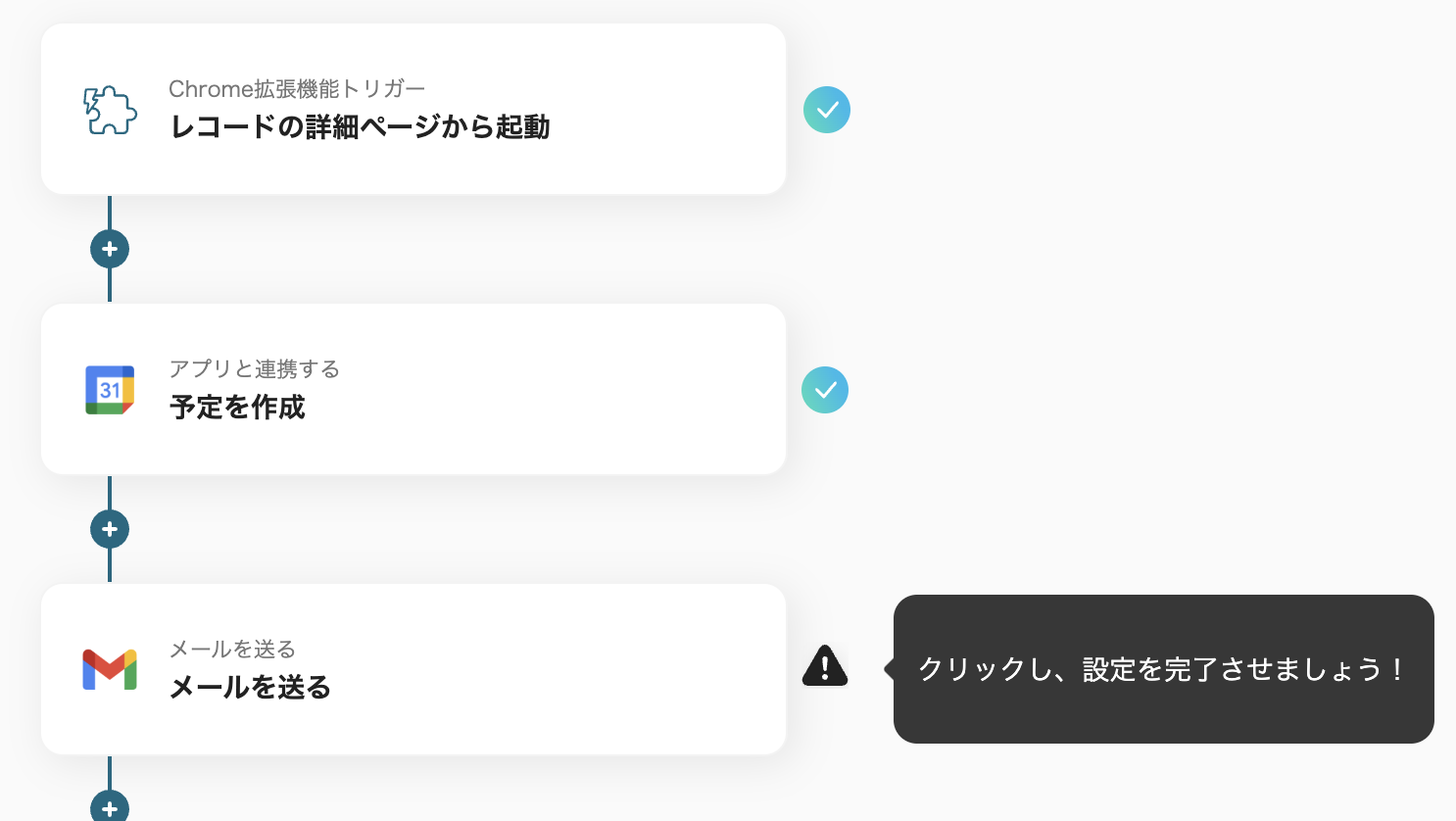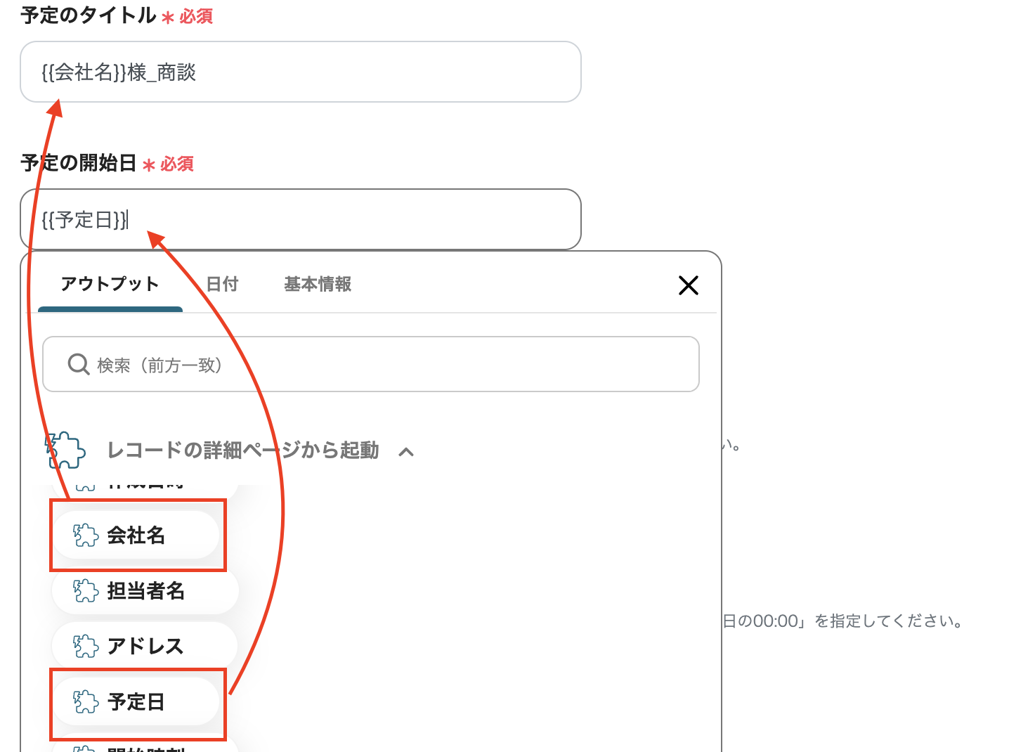 (例として、「予定のタイトル」と「予定の開始日」に、前ステップから取得した【会社名】と【予定日】の情報を引用しています。)