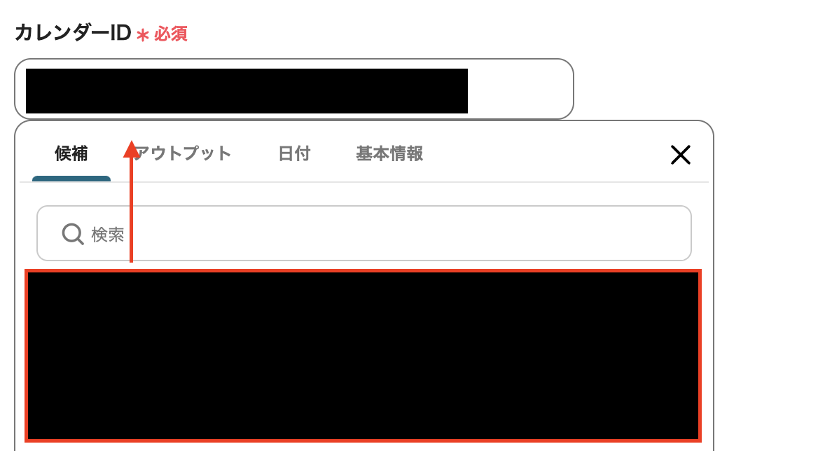 「カレンダーID」の項目は、入力バーをクリックすると以下の画面のようにアカウントから取得した情報を「候補」として展開され、その情報を引用できます。