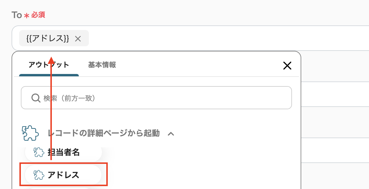 (4)項目によって、入力バーをクリックすると、以下の画面のように前ステップから取得したアウトプットを引用して設定することも可能です。