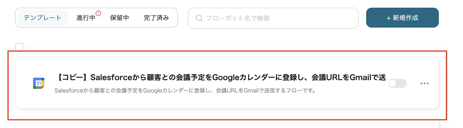 では、「Salesforceから顧客との会議予定をGoogleカレンダーに登録し、会議URLをGmailで送信する」のテンプレートを使ったフローボットを作成していきましょう。