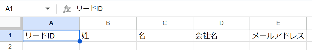 Google スプレッドシートの画面に移動し、Salesforceのリード情報から取得したい項目をテスト用に設定します。