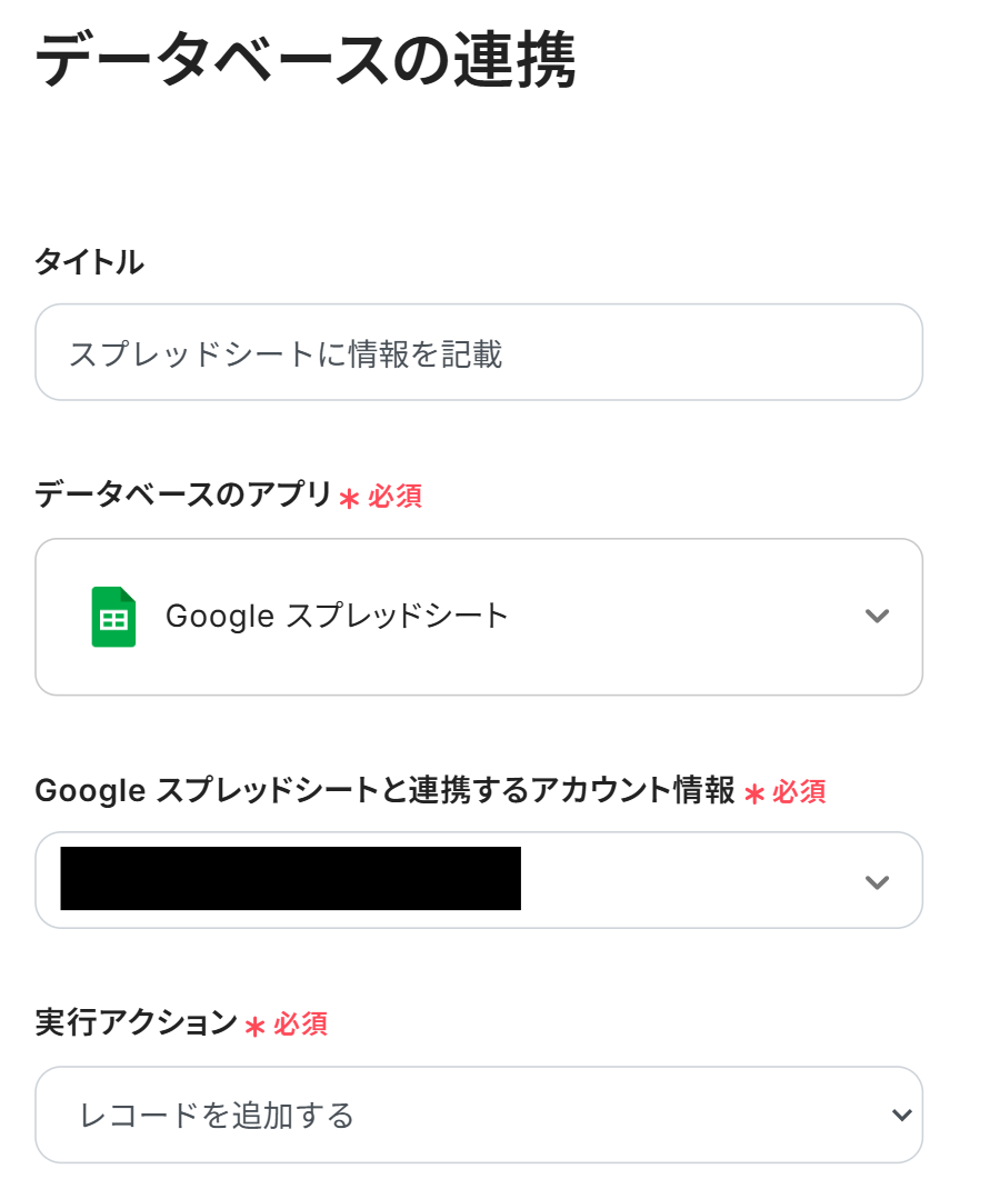 「追加するレコードの値」には先ほどGoogle スプレッドシートで設定した項目名が表示されます。