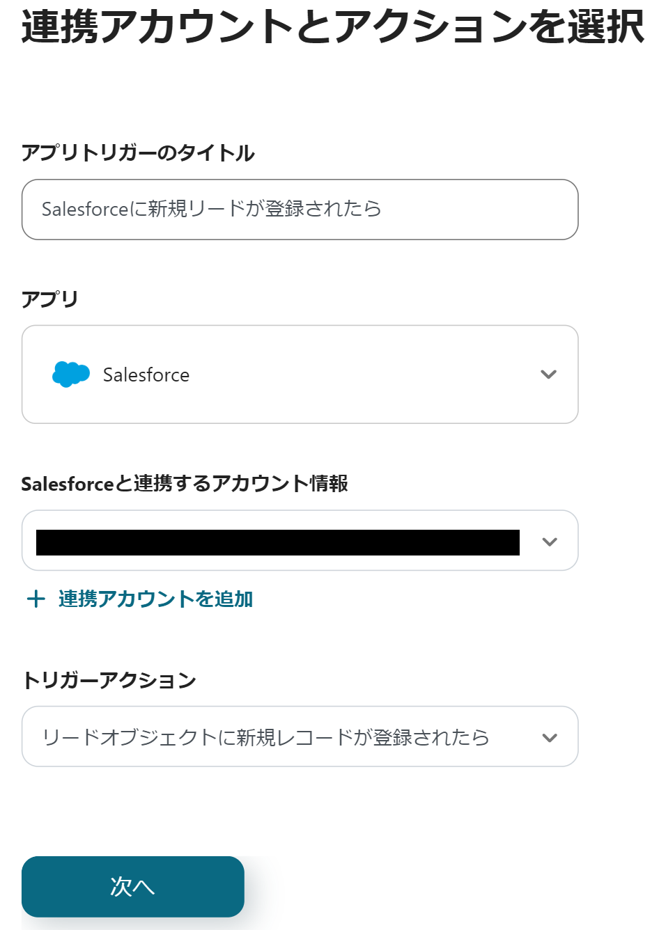 最初に、Salesforceに新規リードが登録されたらフローボットを起動する設定を行うため、「Salesforceに新規リードが登録されたら」をクリックします。