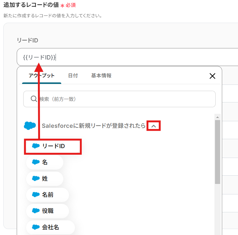 Salesforceにレコードを追加するステップで、「追加するレコードの値」にカスタム項目が表示されます。