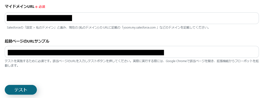 3.マイドメインURL、起動ページのURLサンプルを入力し、「テスト」をクリックします。