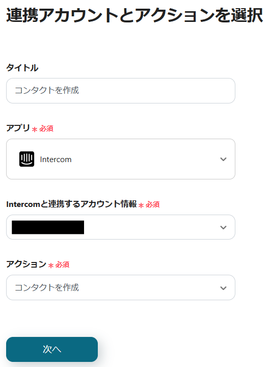 2.Intercomと連携するアカウントを確認し、「次へ」をクリックします。