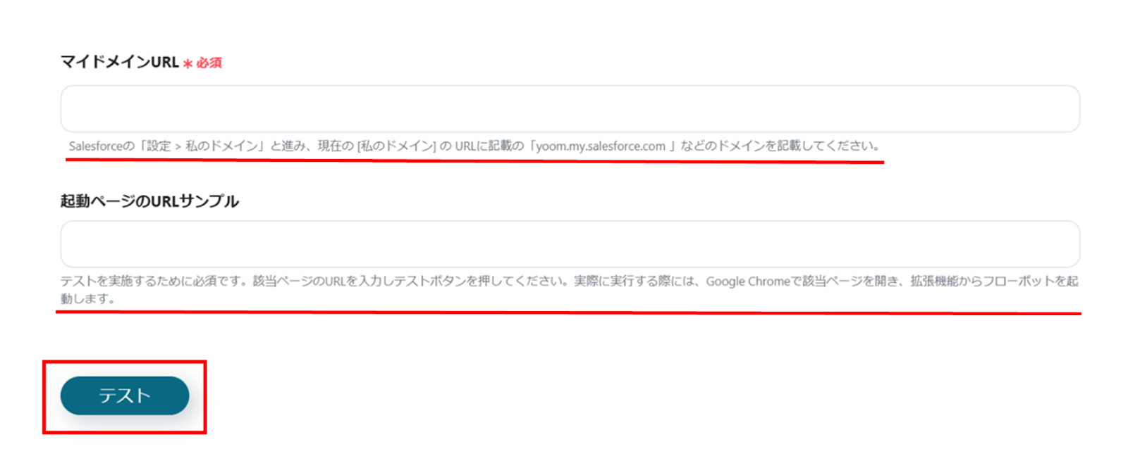 (3)「拡張機能で起動するアプリのAPI接続設定」画面から、赤線を確認の上、マイドメインURL、起動ページのURLサンプルを入力します。