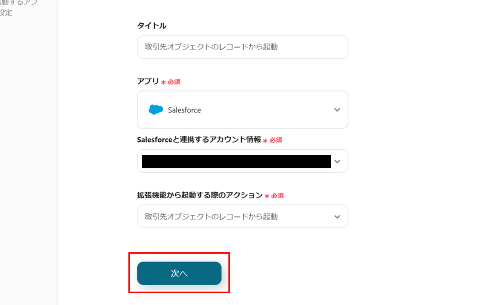 下へ進み、Salesforceと連携するアカウント情報に誤りがないかを確認し、拡張機能から起動する際のアクションは「取引先オブジェクトのレコードから起動」のままで「次へ」をクリックします。