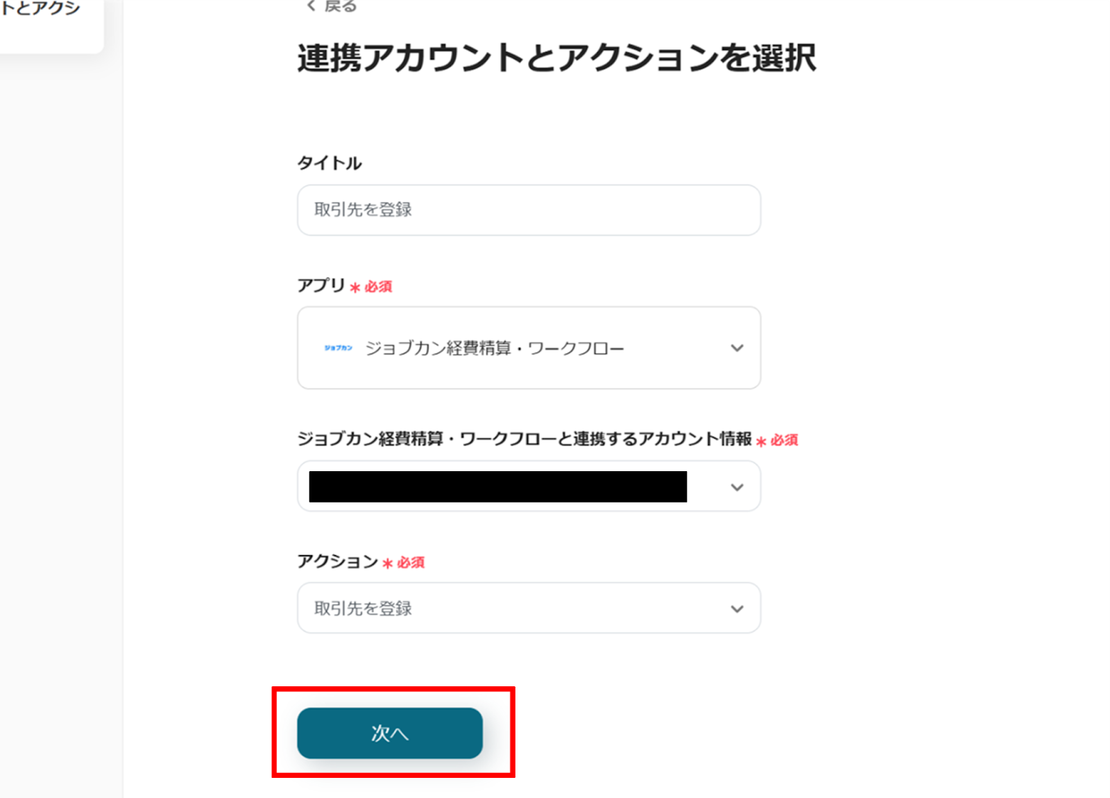(2)ジョブカン経費精算・ワークフローの「連携アカウントとアクションを選択」画面から、ジョブカン経費精算・ワークフローと連携するアカウント情報に誤りがないかを確認し、アクションは「取引先を登録」のままで「次へ」をクリックします。