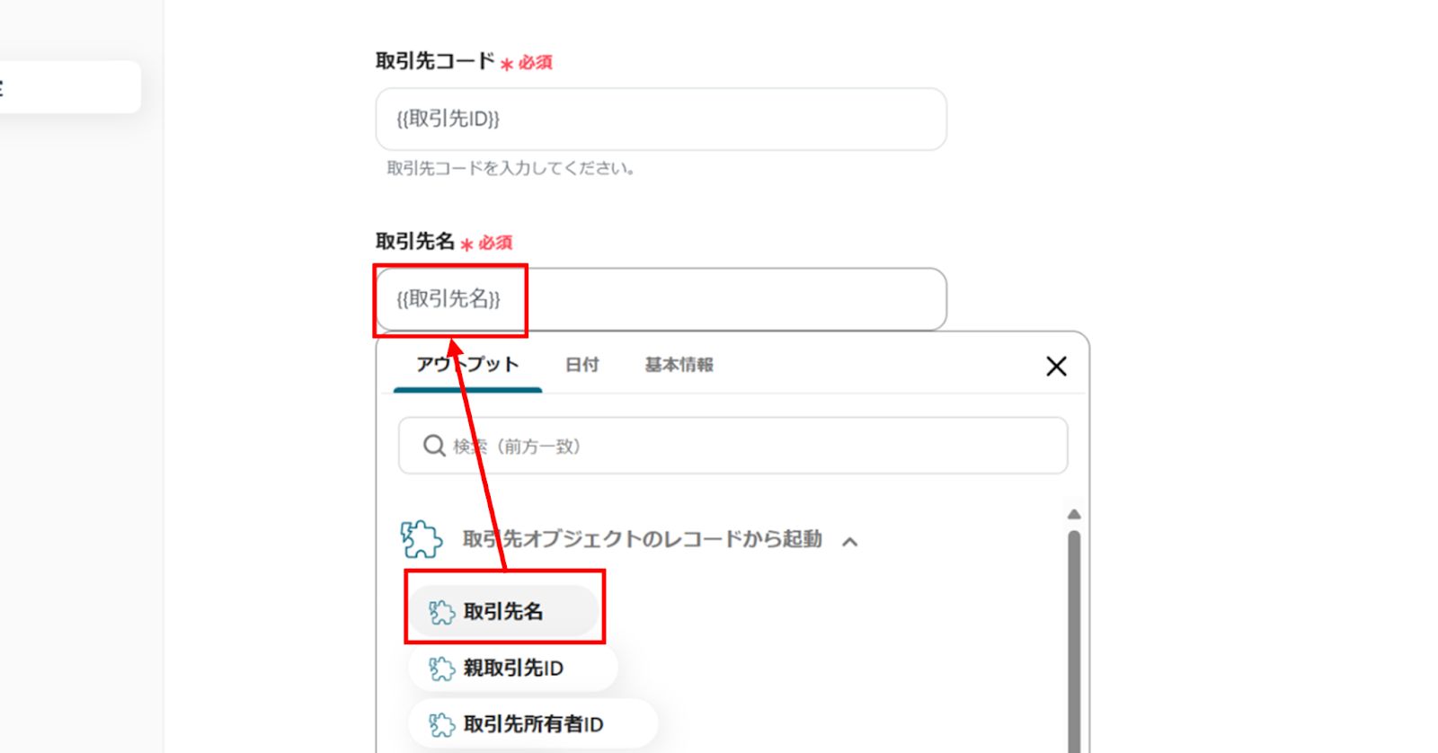 (3)「API接続設定」画面から、取引先コード、取引先名をアウトプットから選択します。