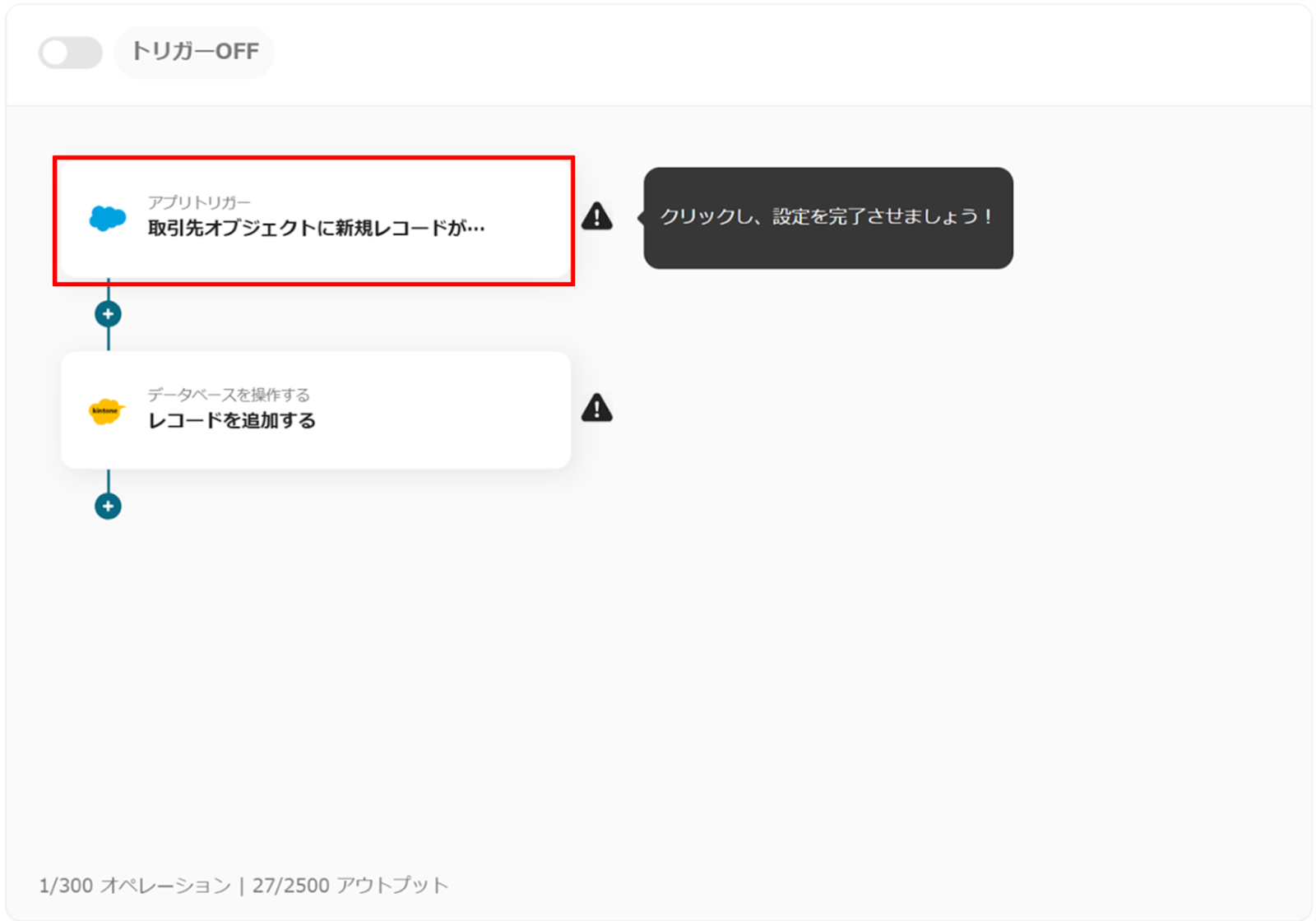 アプリトリガーの「取引先オブジェクトに新規レコードが登録されたら」をクリックします。